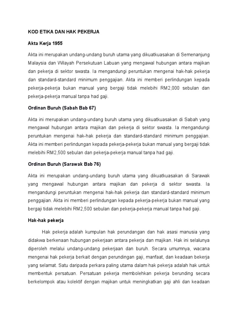 . Hak Kepada Gaji Minima. Apabila membicarakan tentang undang-undang buruh atau pekerjaan Employment Law di Malaysia pastinya ramai yang terfikir mengenai Akta Kerja 1955Ia sememangnya satu perundangan buruh yang amat penting yang menyediakan satu rangka-kerja undang-undang yang menyeluruh meliputi soal pembayaran gaji pekerja hari. Hak pekerja di tempat kerja harus dijaga dan hak majikan juga harus dihormati dan diakui.